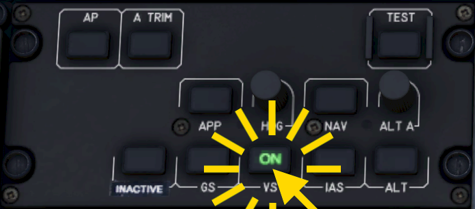Once engaged the VS button turns green and the FMA shows “VS” in green.