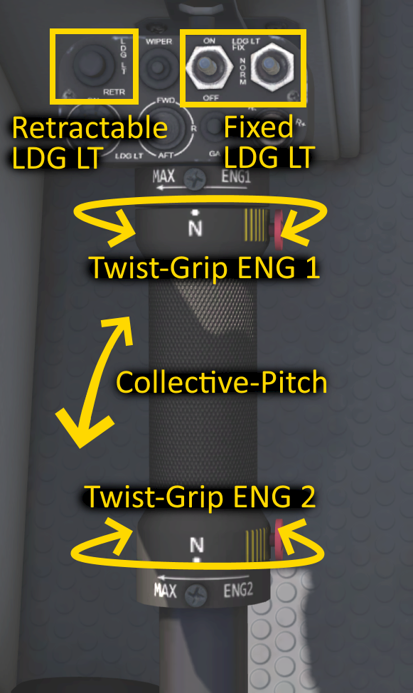 At the top and bottom of the collective pitch handle you can control the twist grip rotation for the upper and lower half of the lever. The twist grip is usually at the neutral center position throughout the entire flight. You can however rotate the twist grips out of the center position to take over manual fuel control of the individual engines. Rotating the lever with the left thumb down closes the fuel flow. The dot and N label move towards the right hand side, away from the MAX label above it. This causes the engine 1 or 2 to spool down to idle or even below idle into cut off if you twist it all the way.