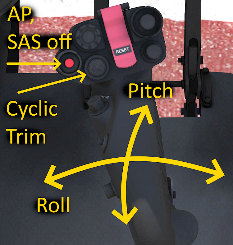 In front of the pilot seat you can find the cyclic, to the left of the pilot seat is your collective pitch lever. The feet control the pedals.