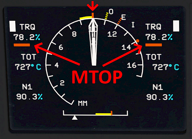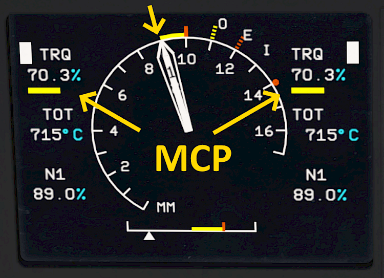 Usually the limiting factor is the engine torque and for an all-engine-operating condition the needle reaches maximum continuous power at around 70% torque. The indication is underlined yellow.
