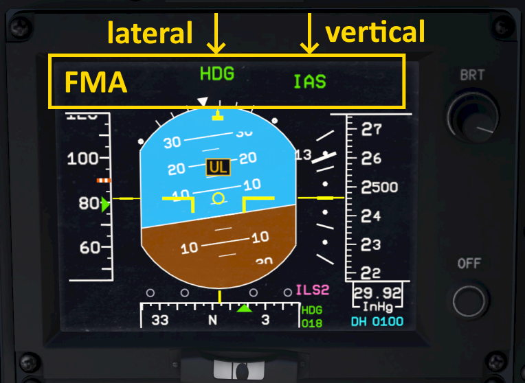 An mode is an upper mode whenever it does more than just maintain attitude. When an upper mode is engaged it is also shown in green in the flight mode annunciator (FMA) at the top of the primary flight display (PFD).