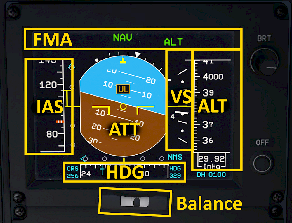 At the top of the PFD you can flight the autopilot flight mode annunciator (FMA). The FMA shows the autopilot upper modes which is discussed in further detail in the autopilot section.