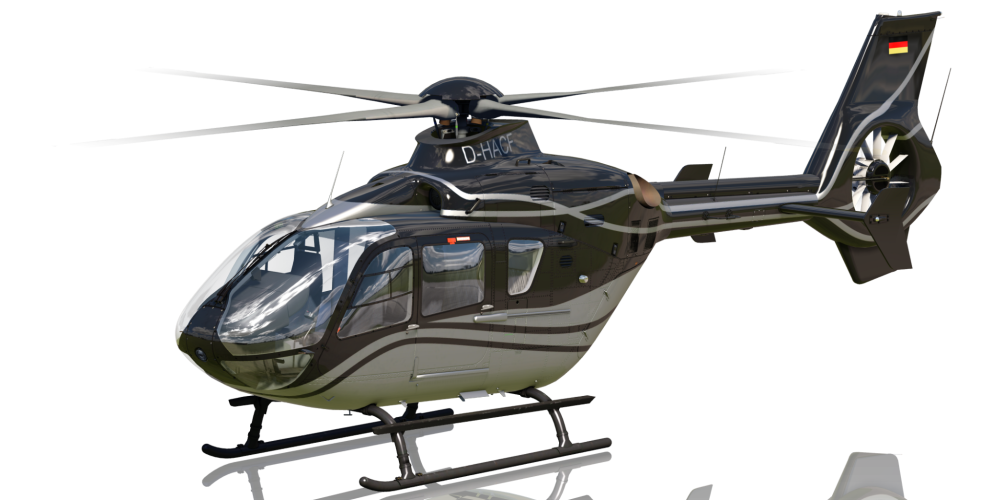 The EC135 is a very popular twin-engine helicopter which is used for passenger and cargo transport by the police and military, offshore operations as well as medical transport or evacuation. The EC135 can easily be recognized by the Fenestron surrounding and protecting the tail rotor and it’s four-bladed main rotor. The model comes with a low and high-skid variant which can be selected as part of the repaint in Aerofly FS.