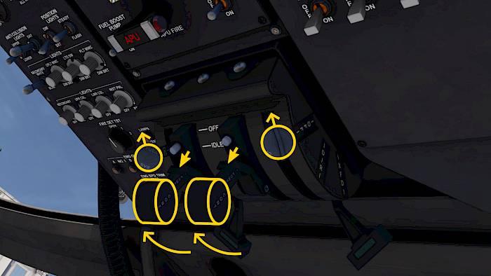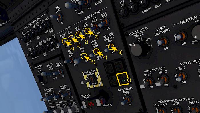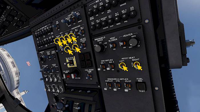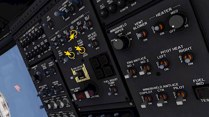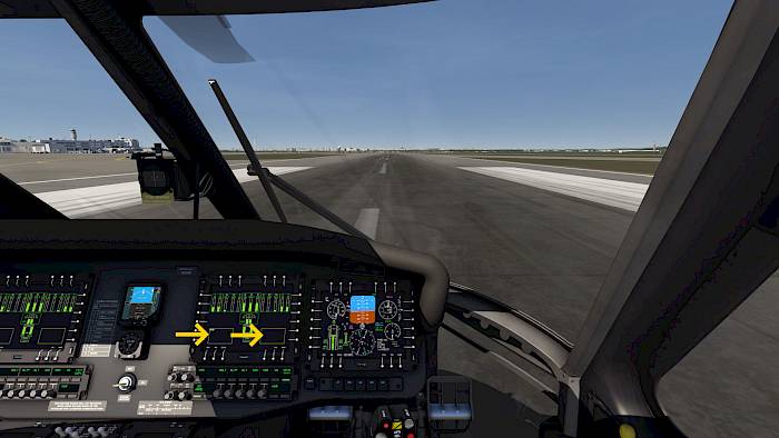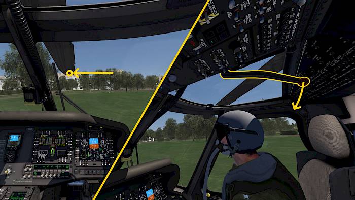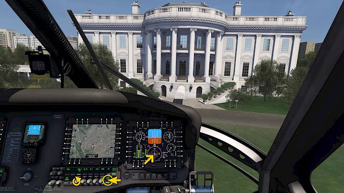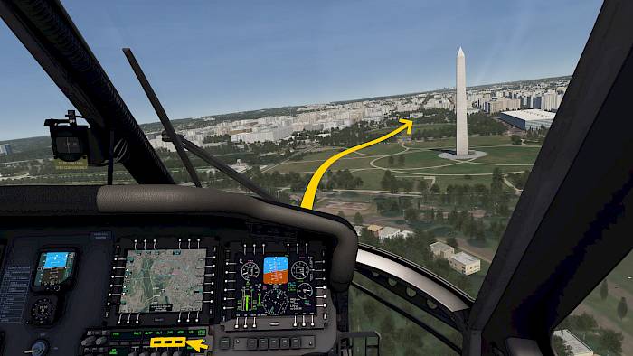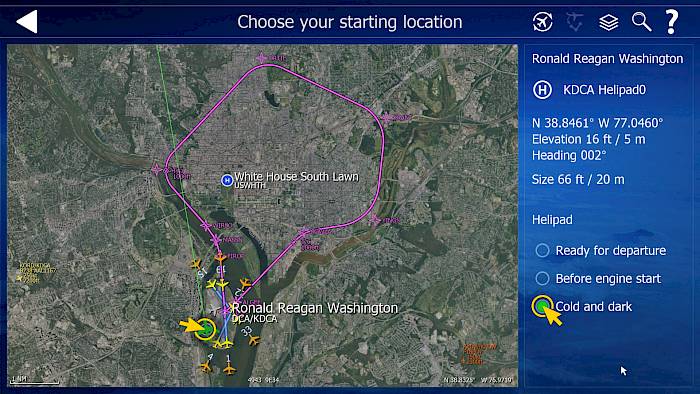 In this tutorial we’ll show you how to start the engines from a “cold and dark” preset, with all engines cold and electrical systems off and cockpit dark, just like for the first flight of the day. To start this tutorial please click on a parking position or helipad in the location menu and then select the cold and dark option. We’re starting our tutorial at the Washington Ronald Regan Airport in the south west apron. From the Ronald Regan Airport we’re going to fly north east before heading back west to the White House to drop off the President of the United States of America. This scenic route will take over the Capitol and Washington Monument.